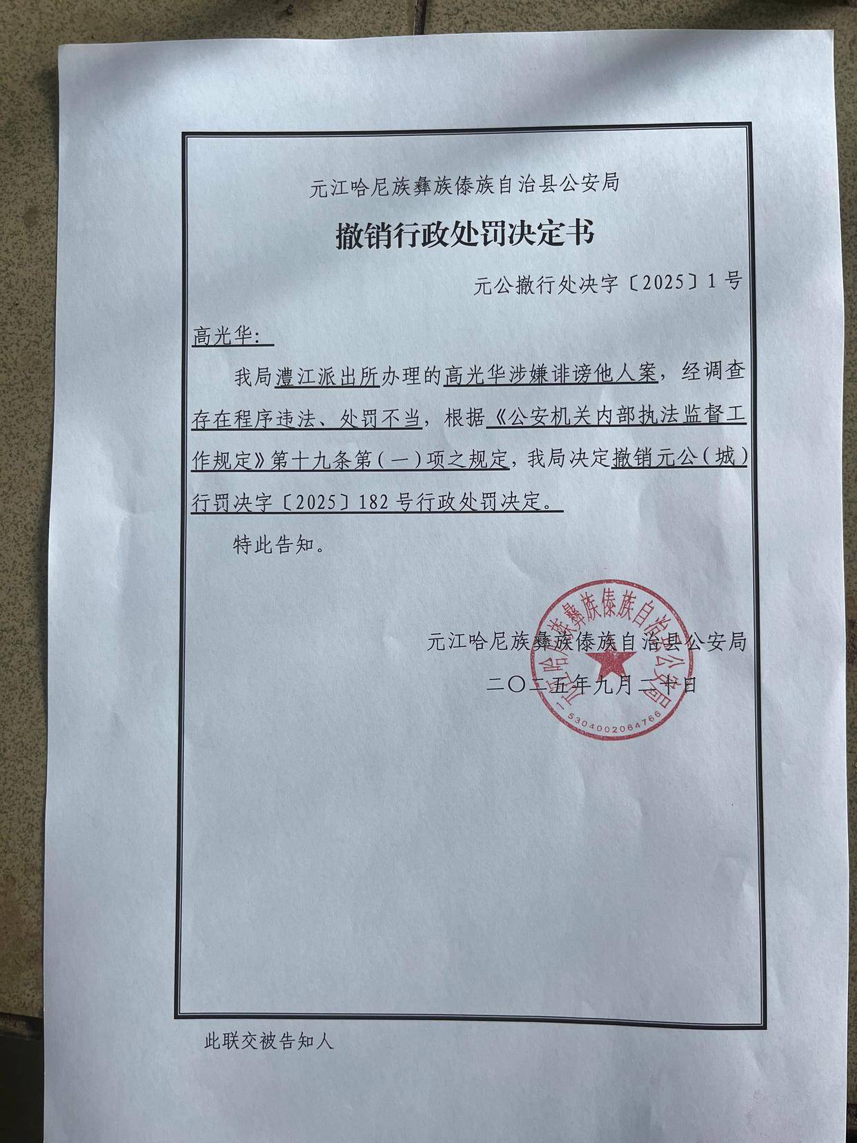 △元江县公安局出具的撤销行政处罚决定书