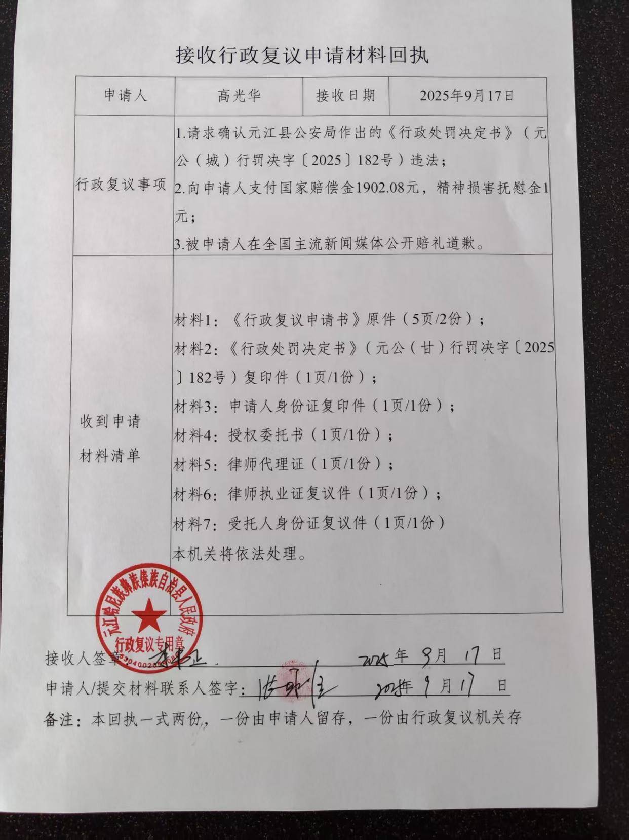 9月19日,潇湘晨报记者从当事人处了解到,高光华不服该处罚决定,已向元江县人民政府申请行政复议,请求确认被申请人元江县公安局所作的《行政处罚决定书》违法,并申请被申请人支付国家赔偿金1902.08元,精神损害抚慰金1元。