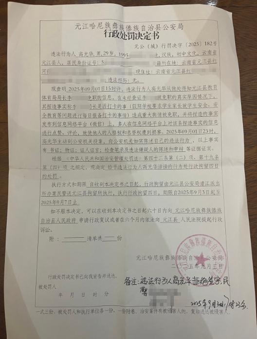 元江县公安局所作的元公(城)行罚决字〔2025〕182号行政处罚决定书称,高光华在未经查证李某某被免职的真实原因情况下,捏造事实称李某某因当地一涉及暑假假期学生安全的重大舆情事项被免职,致使他人的人格权和名誉权遭到损害。