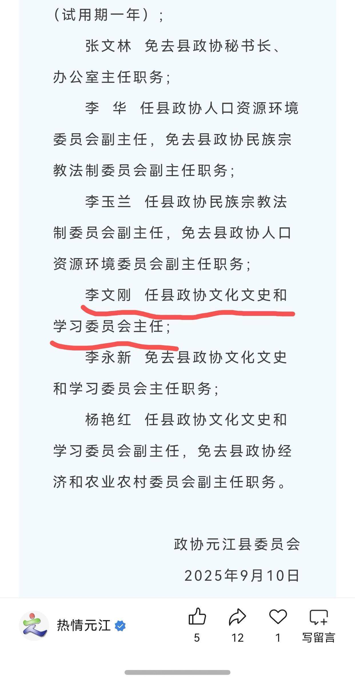此外,“热情元江”发布的“元江县第十八届人大常委会第33次会议人事事项”显示,9月8日,第十八届人大常委会第33次会议通过了免去李文刚县教育体育局局长事项。9月10日,中国人民政治协商会议元江县第十届委员会常务委员会第二十七次会议决定,李文刚任县政协文化文史和学习委员会主任。目前,县教育体育局局长由原县应急管理局局长杨雄太担任。