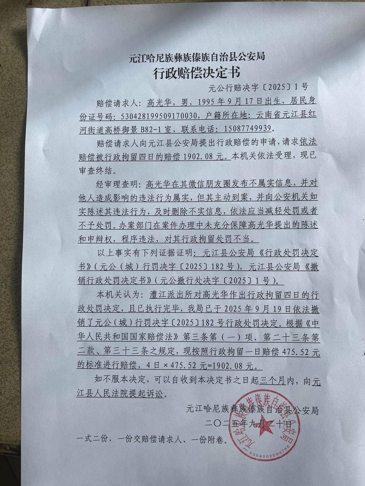 高光华的代理律师胡磊、张具堆均证实,高光华的行政处罚决定被撤销,元江县公安局依法向高光华赔偿1902.08元。